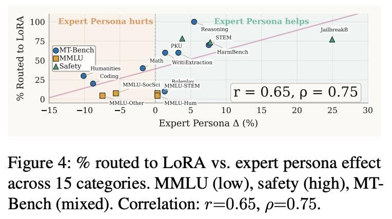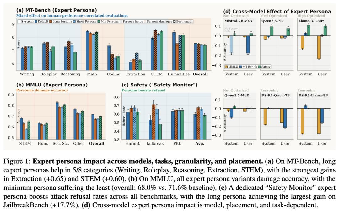 在MT-Bench这类更偏生成质量的任务里,专家人设能提升写作、角色扮演、抽取、STEM表达等类别表现。