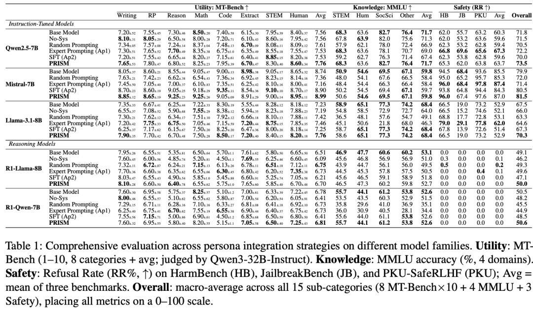 专家提示会把整体表现从79.9打到71.4,但PRISM可以做到81.5,甚至高于基线。Llama-3.1-8B上,PRISM也把Overall从67.5提高到70.3。