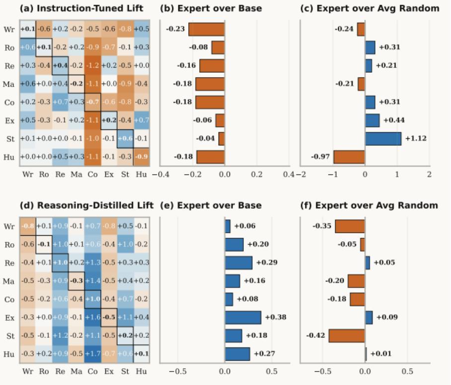大模型「偏科」热力图:蓝色代表能力提升,红色代表能力受损。在普通指令微调模型(左图)中,大量出现的红色色块显示:所谓的专家人设正在全面破坏模型的客观知识准确度。