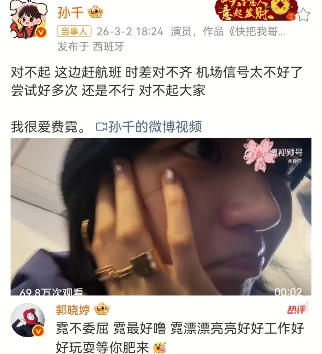 之前孙千发的剧组花絮里,就有一张郭晓婷亲吻她脸颊的照片,同剧演员王天辰还调侃两人“亲上了”,足以看出她们日常相处有多亲近。这次孙千直播出状况、发微博道歉后,郭晓婷也第一时间留言安慰,用剧中昵称叫她“霓”,语气俏皮又暖心,完全没有明星之间的客套。