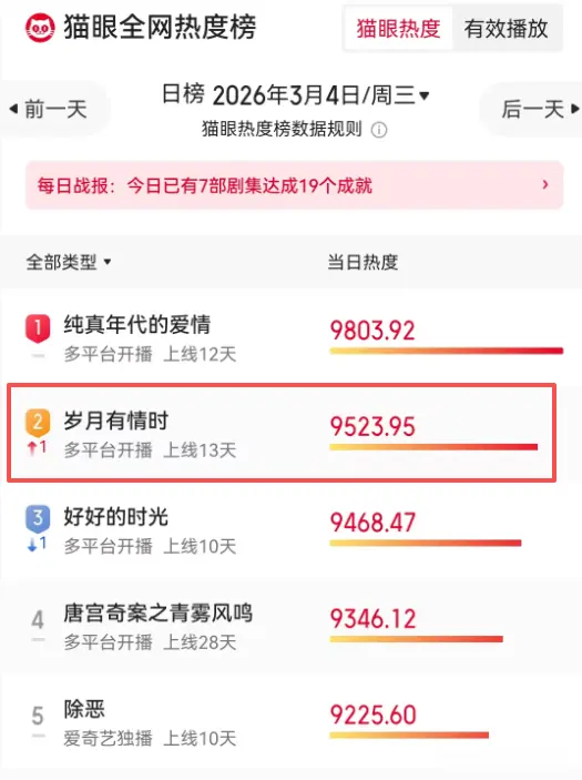 在热度上,《岁月有情时》竟然都比不上隔壁的《纯真年代的爱情》。