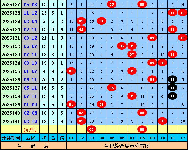 后区分析:上期该位开出奖号02和10,和值为12,跨度为8,后区前4次开出和值12和跨度8时,其下期奖号分别为:04+11、01+06、04+07、01+08,号码奇偶比为4:4,大小比为3:5,012路比为1:5:2,本期后区号码参考01、03、08、09、12,精选两码03、08。